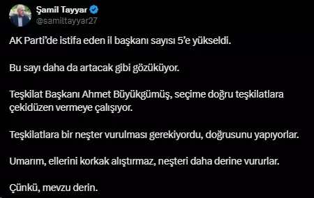 AK Parti’de peş peşe istifalar yaşanırken eski AK Parti Milletvekili Şamil Tayyar’dan dikkat çeken bir değerlendirme geldi. Tayyar, istifalar üzerine sosyal medyadan yaptığı paylaşımda sürecin devam edeceğine işaret ederek şu ifadeleri kullandı: