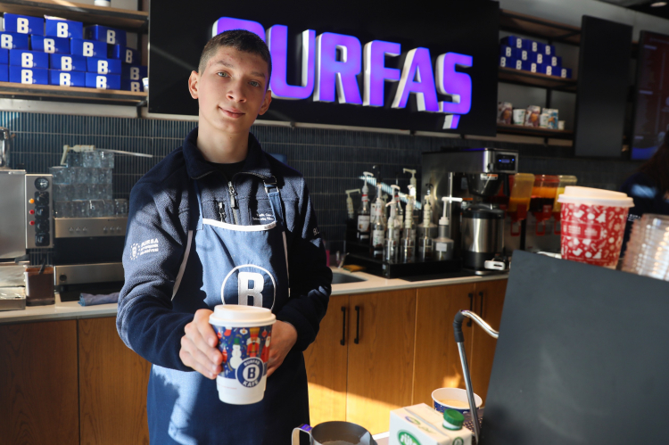 Merinos Parkı’ndaki BURFAŞ B Kafe’de stajyer barista olarak görev yapan 16 yaşındaki Ümit Hazar, barista önlüğünü giyerek personelle birlikte siparişleri titizlikle hazırlıyor. B Kafe’de staj yapmaktan mutluluk duyduğunu söyleyen Hazar, kafeye gelen vatandaşlardan da büyük takdir topluyor.